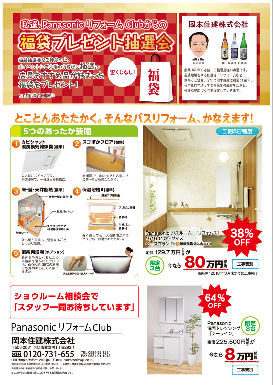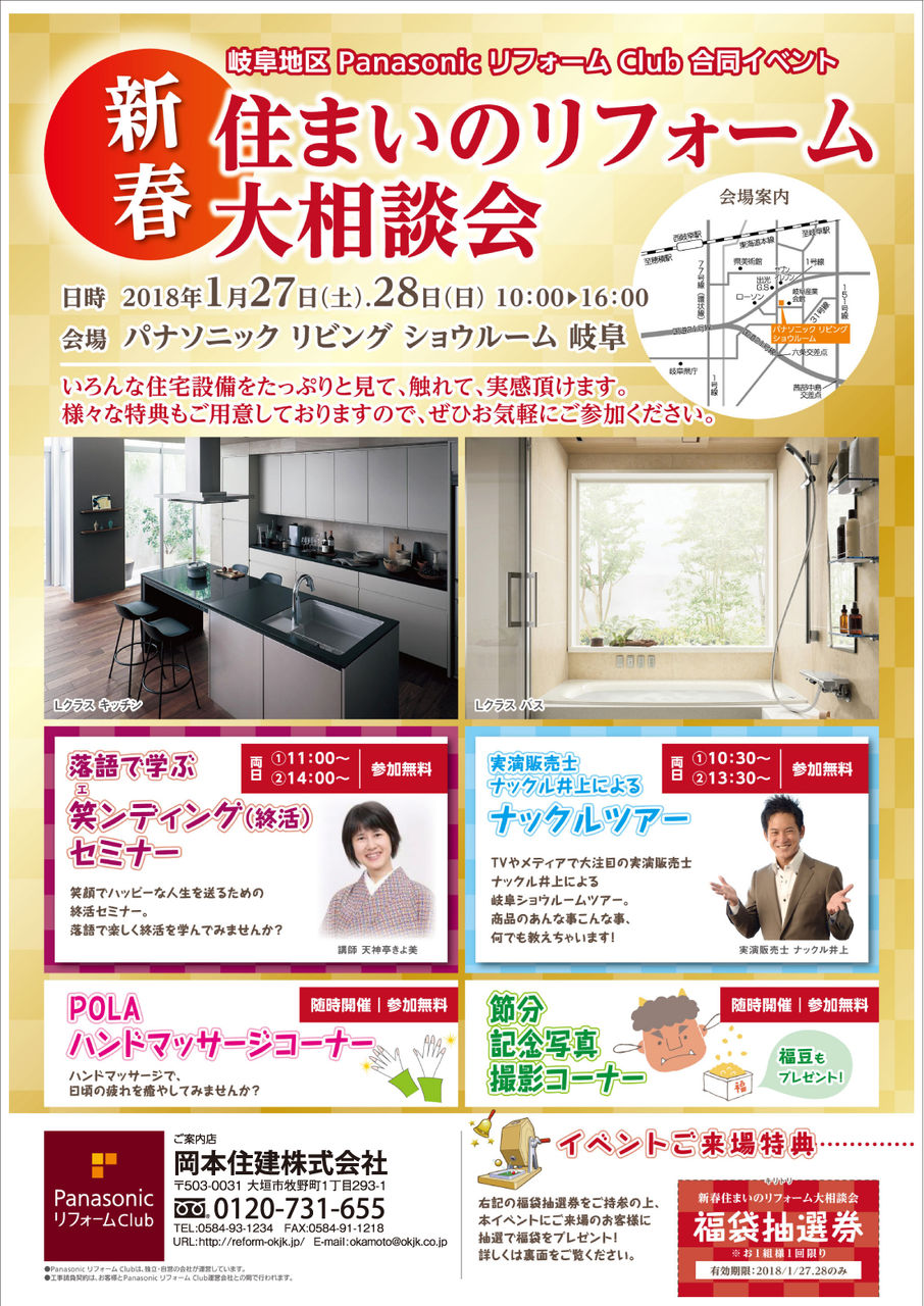 2018年01月25日 新春リフォーム大相談会 こんにちは、リフォーム担当 小山です。会社の花壇もすっかり雪景色です。さて、しばらく寒い日が続きますが、今週末は久しぶりのイベントです。1月27日(土)・28日(日) パナソニックショールームにて【新春 住まいのリフォーム大相談会】 を行います。イベントご来場特典として、暖かいリフォムスのお風呂も特別価格にてご提供いたします。ぜひお越しくださいませ。
