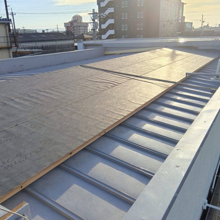 “見えない工事”で安心をプラス。二重屋根で雨漏りしない建物へ 雨漏りの不安を解消する屋根改修リフォーム◆羽島郡岐南町F様 店舗 近年、短時間で大量の雨が降る“ゲリラ豪雨”が増え、これまで問題のなかった建物でも雨漏りが発生するケースが増えてきています。 今回ご相談いただいた建物でも、大雨時に建物内部へ雨漏れが起こり、早急な改善をご希望されていました。(岡本住建施工の建物ではありません) 現地を確認したところ、屋根は陸屋根形状で、排水には箱樋が使用されていました。雨漏れが発生した部分は樋が狭くなっており、大雨時にオーバーフローしてしまった可能性が考えられました。 そこで、既存屋根の上に新たな屋根を設ける「二重屋根工法」を採用し、降雨量を分散させる対策をご提案。 下からは見えない施工ではありますが、この工法により既存樋への負担が大幅に軽減され、大雨時でも安心できる屋根へと改善することができました。 施工後は雨漏れが一切発生しておらず、お客様にもご安心いただいております。 また、火災保険の申請にもお手伝いし、一部費用が補填されたことで大変喜ばれました。 近年の住宅はデザイン性を重視し、屋根が見えにくいつくりも増えていますが、見えない部分こそ大雨対策は重要です。 雨漏りでお困りの際は、早めの点検・対策をおすすめいたします。 AFTER 調査後はクレーンで材料を荷下ろしし、大工さんにて屋根造作。 BEFORE 屋根に上り、現状を確認。ホースで水を流してどこから雨漏りがしているのか調査します。 AFTER 屋根組が完了し、防水シートを敷き下地が完成(1日) AFTER 屋根は板金の縦ハゼにて施工。樋を別経路で接続し排水経路を分散させました。 画像クリックで拡大します